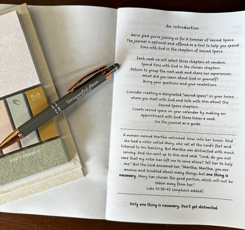 Sacred Space is the book. It calls itself: A Little Book of Encouragement. In its pages are 70 short devotionals (chapters, they call them) based on passages from the Gospels. We’ll select three each week using a lottery system to spend time in with God. Then we’ll gather together to share what we experienced with Him in our sacred space.