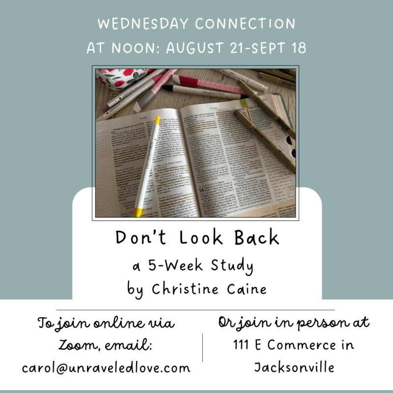 You are invited to join us online or in person at our table on Wednesdays at noon to share God’s Word together and you are welcome to bring your lunch. We try to keep our gathering time to around an hour. What better way to spend your lunch break! Study guides can be purchased at Unraveledlove.com or in the shop. There is no work to be done before our first session.