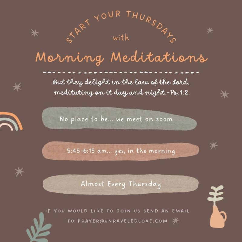 Meditation is a prayer practice most of us find hard to do. Once the day begins our lives and schedules are full. Carving out time for silence and meditation can be tricky. We can help with that. Join us online Thursday mornings at 5:45 for guided meditation. Or you can find our guided meditations on the Unraveled Love Podcast to use when your schedule allows.
